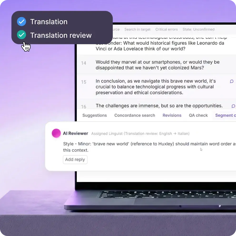 Automate your linguistic review process with expert-enabled AI agents that work like subject matter experts inside your existing workflow. These agents scan for quality and brand voice to provide instant suggested edits and clear explanations so your team can act quickly.